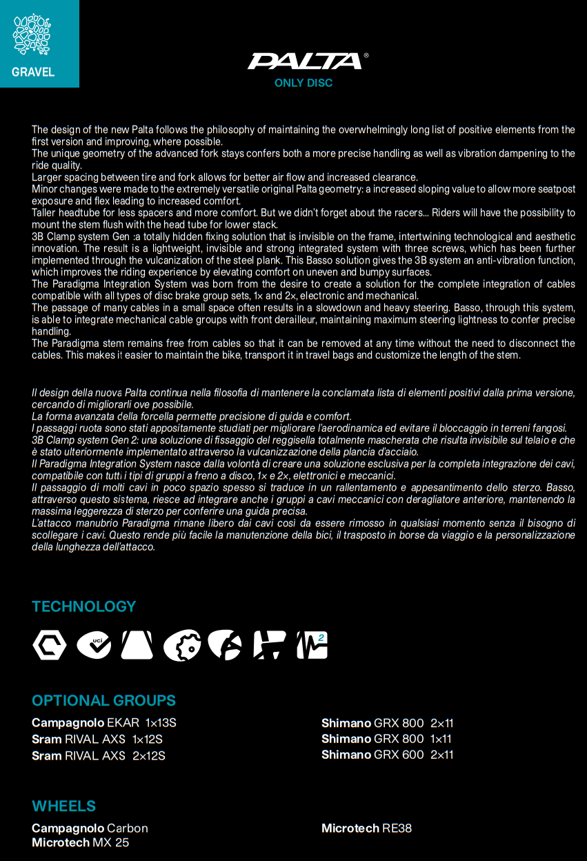 Larger spacing between tire and fork allows for better air flow and increased clearance. Minor changes were made to the extremely versatile original Palta geometry: a increased sloping value to allow more seatpost exposure and flex leading to increased comfort. Taller headtube for less spacers and more comfort. But we didn’t forget about the racers… Riders will have the possibility to mount the stem flush with the head tube for lower stack.