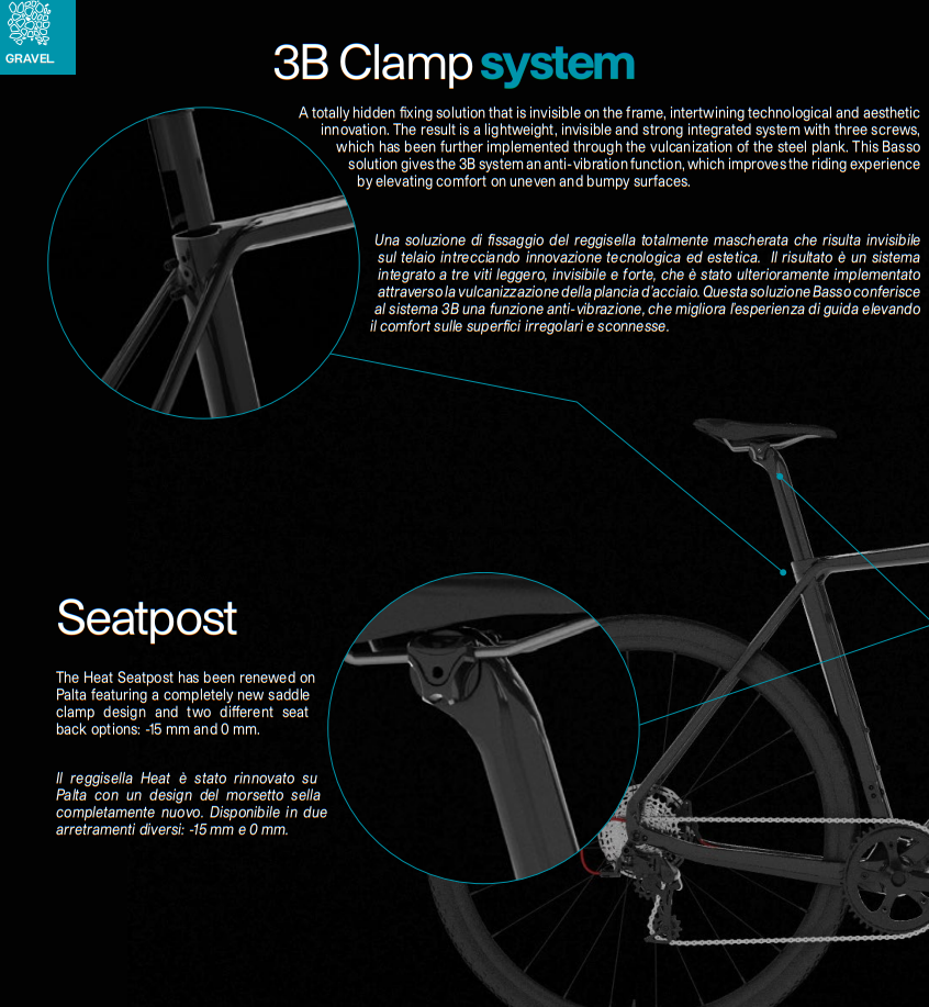 3B Clamp system 2 Gen: a totally hidden fixing solution that is invisible on the frame, intertwining technological and aesthetic innovation. The result is a lightweight, invisible and strong integrated system with three screws, which has been further implemented through the vulcanization of the steel plank. This Basso solution gives the 3B system an anti-vibration function, which improves the riding experience by elevating comfort on uneven and bumpy surfaces.