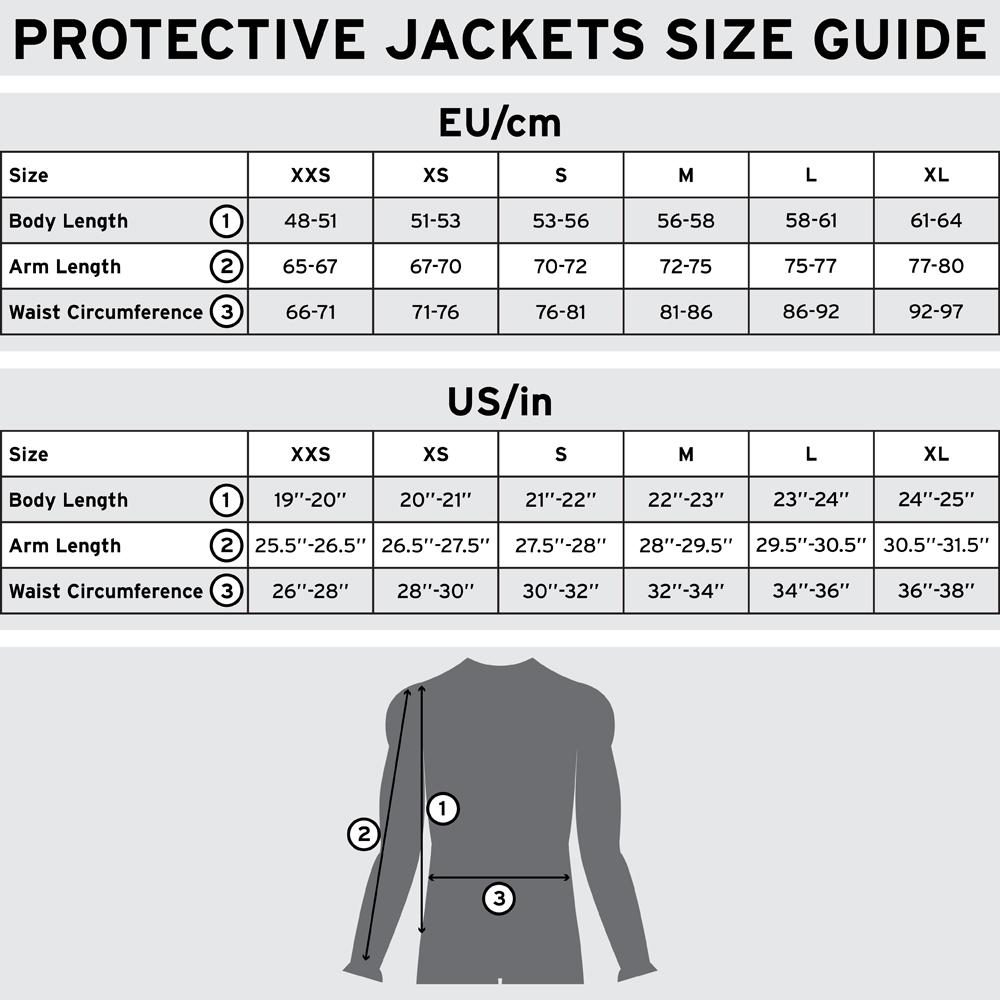 STRUCTURE: Super stretch nylon fabric, Protectors on shoulders, elbows and forearms, Velcro sleeves, Zipper on the front,